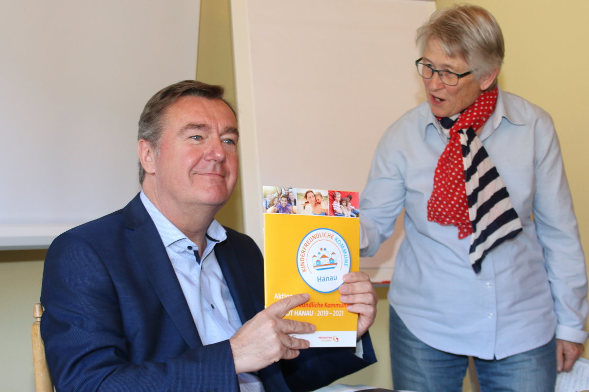 Erstes druckfrisches Exemplar des 2. Aktionsplanes 2019 – 2021 der "Kinderfreundlichen Kommune Hanau" an OB Klaus Kaminsky